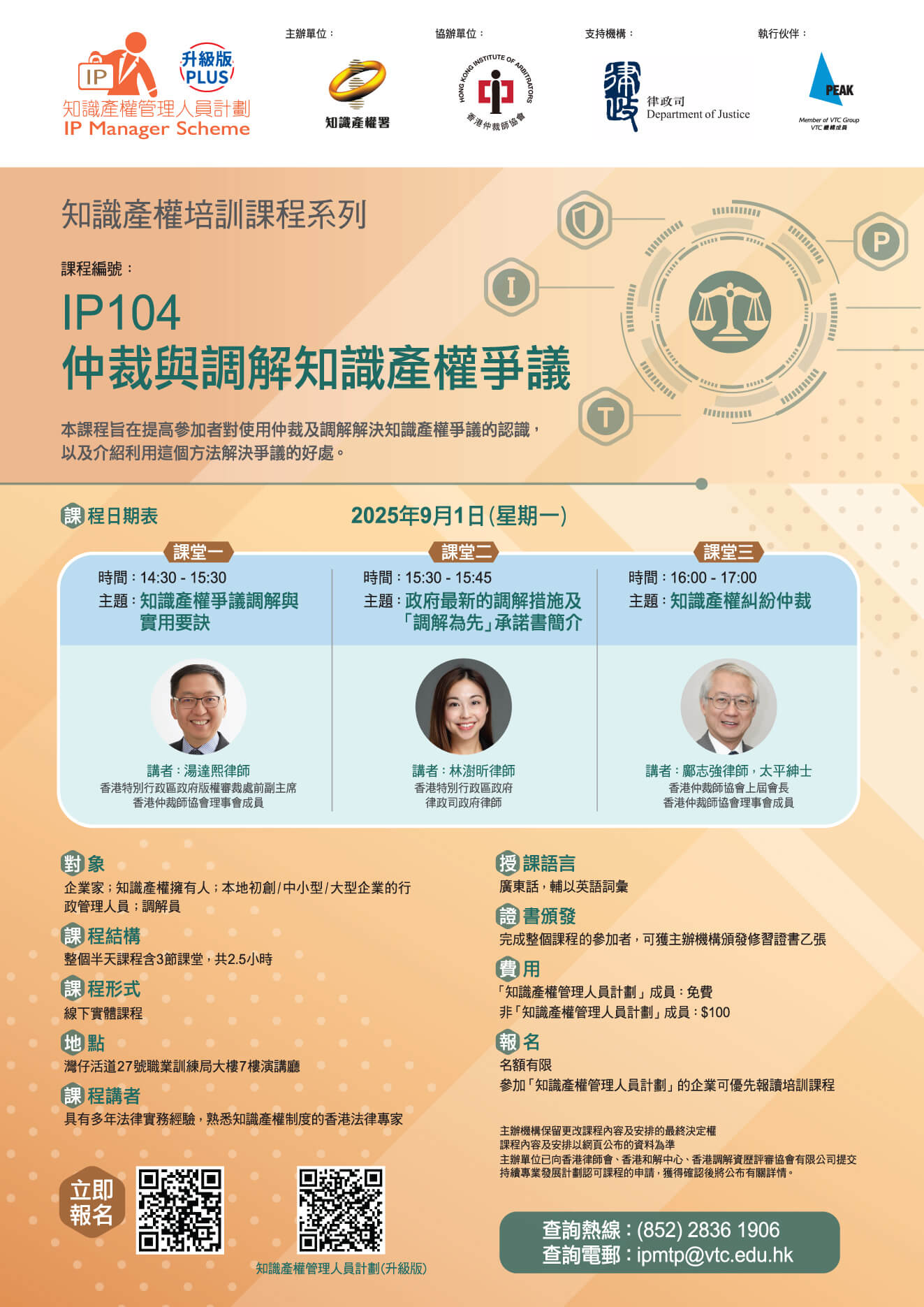 | 費用 | : | 「知識產權管理人員計劃(升級版)」成員:免費;非「知識產權管理人員計劃」成員:$100 |