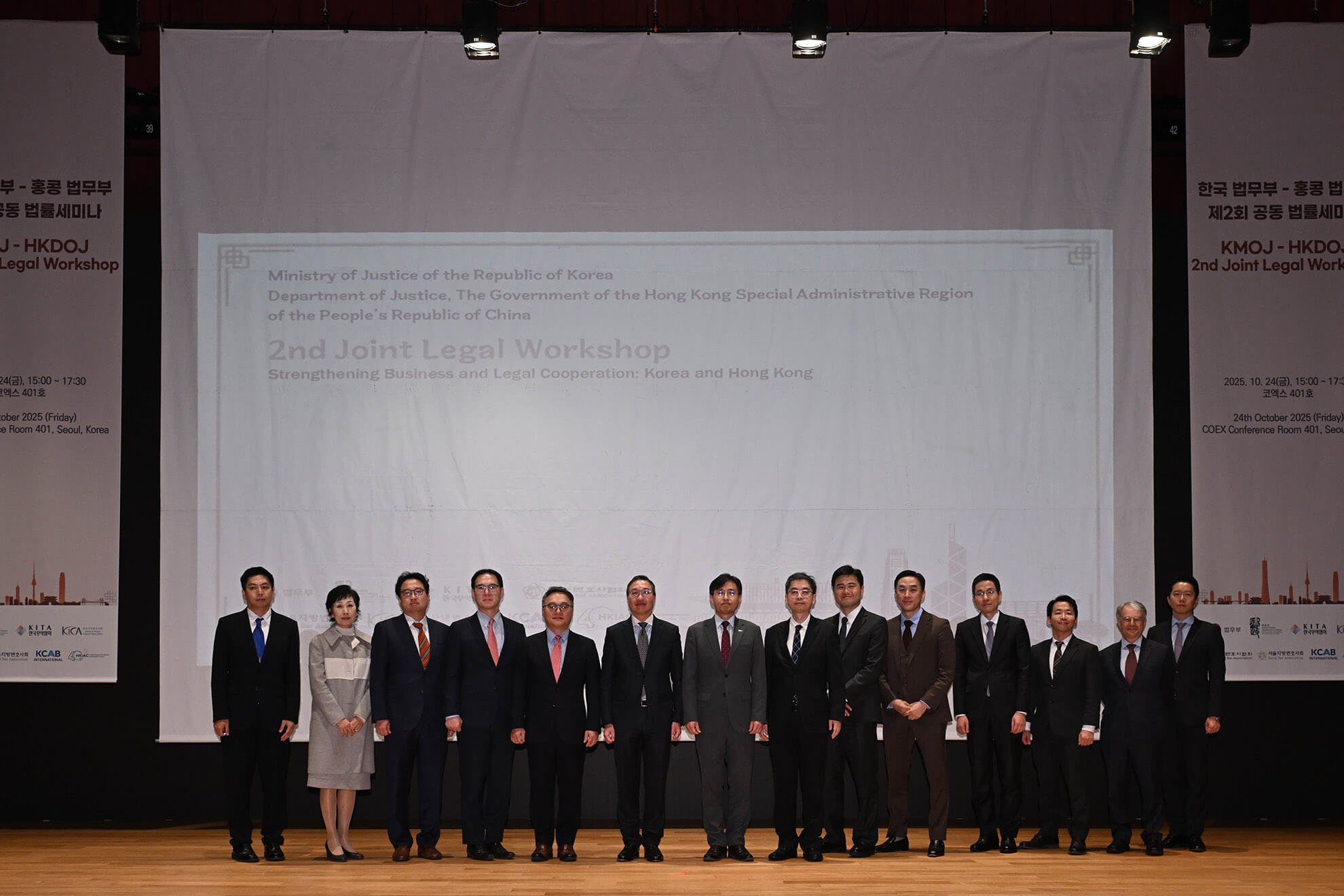 律政司司长林定国资深大律师今日(十月二十四日)在韩国首尔出席由律政司和韩国法务部合办题为「加强韩国与香港的商业和法律合作」的联合法律工作坊。图示林定国(左六)丶韩国法务部国际法律事务部副部长郑洪式(左五)丶律政司国际法律专员丁国荣博士(右七)丶韩国贸易协会贸易推广组执行董事Jeong Hee-cheol(左七)与讲者及其他嘉宾合照。