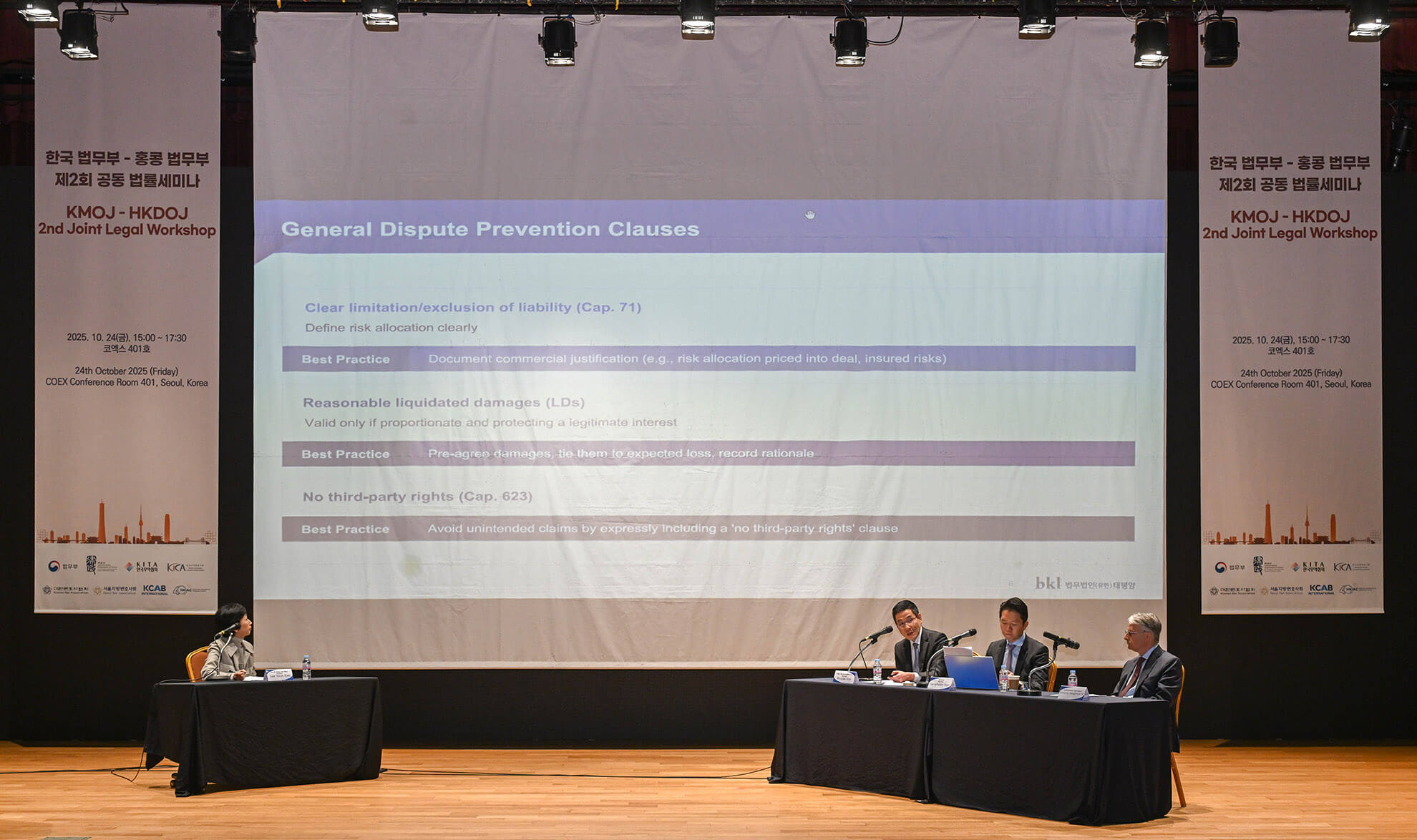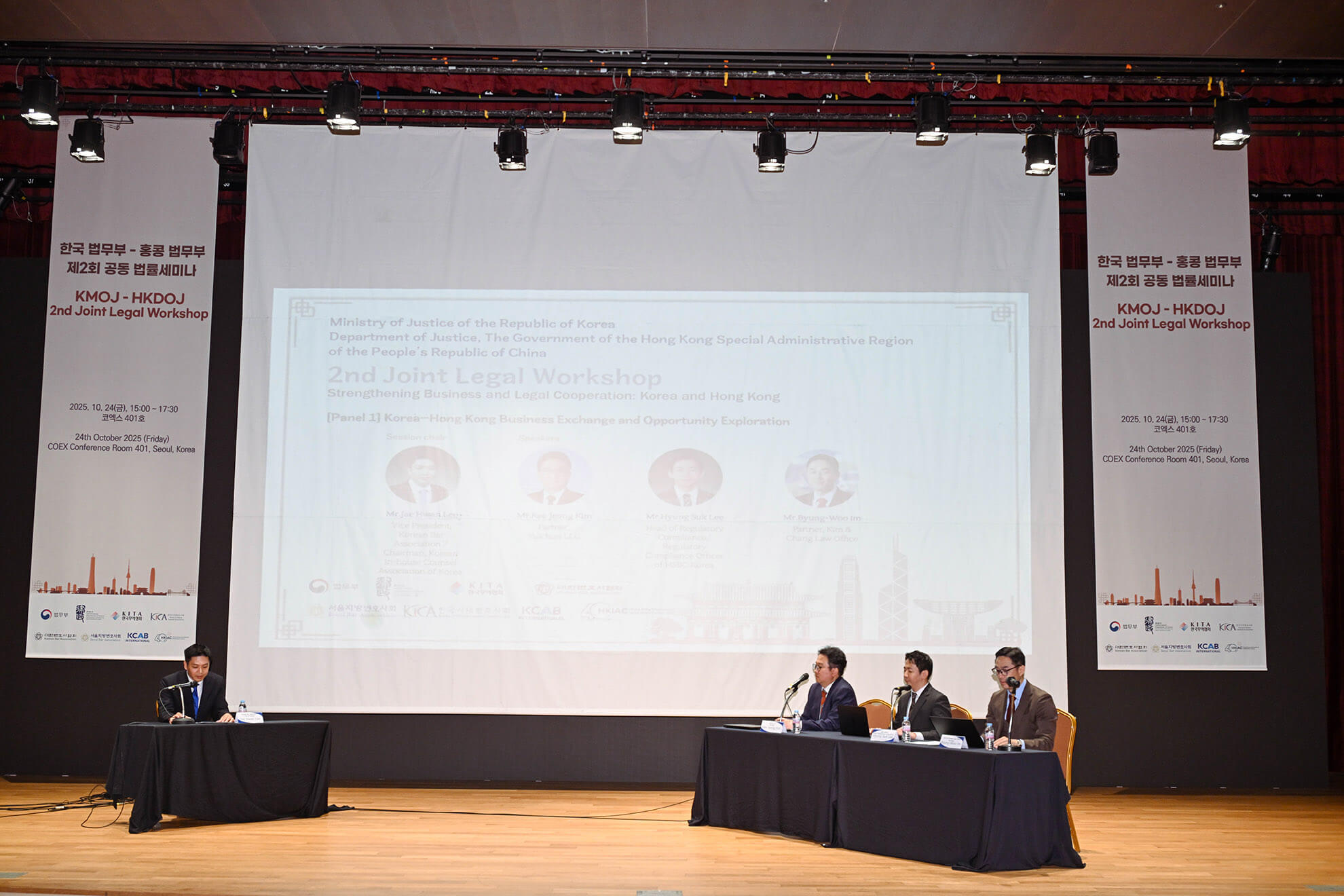 律政司司长林定国资深大律师今日(十月二十四日)在韩国首尔出席由律政司和韩国法务部合办题为「加强韩国与香港的商业和法律合作」的联合法律工作坊。图示工作坊的第二节专题讨论环节。