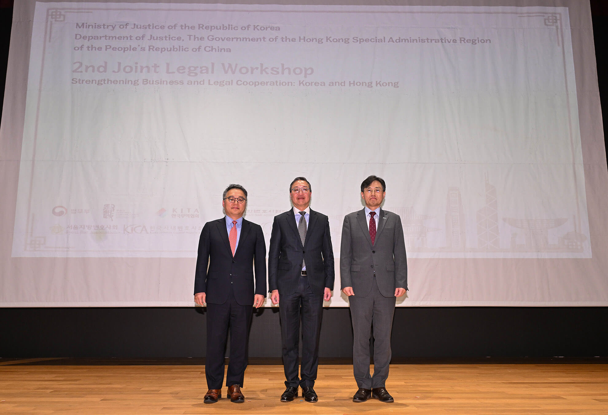 律政司司长林定国资深大律师今日(十月二十四日)在韩国首尔出席由律政司和韩国法务部合办题为「加强韩国与香港的商业和法律合作」的联合法律工作坊。图示林定国(中)丶韩国法务部国际法律事务部副部长郑洪式(左)和韩国贸易协会贸易推广组执行董事Jeong Hee-cheol(右)在工作坊上合照。