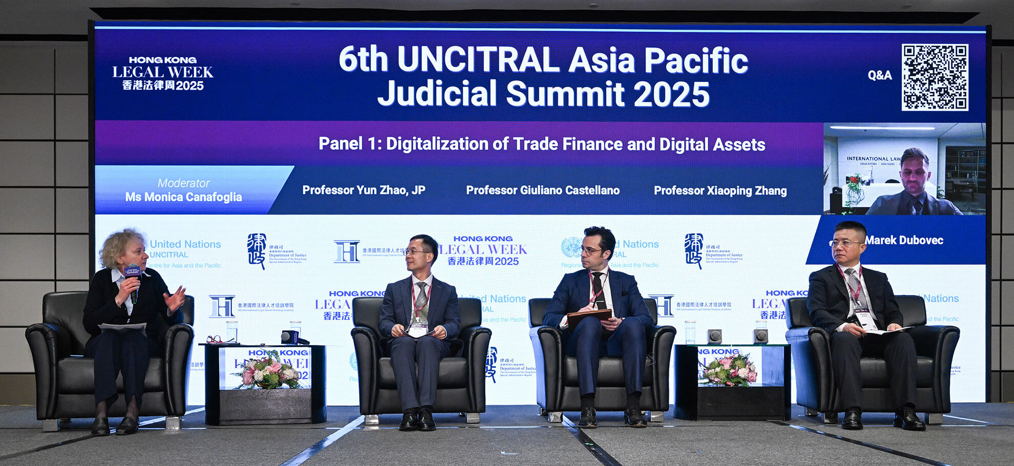 香港法律周2025今日(十二月一日)啓动,以「法汇香港 联通世界」为题,展开为期一连五日的活动。图示(左起)联合国国际贸易法委员会法律干事Monica Canafoglia丶香港大学法律学院郑家纯基金国际法教授兼副院长(内地事务)赵云教授丶香港大学法学院亚洲国际金融法研究所副教授兼所长祖里亚教授丶中央财经大学法学院副教授张小平教授丶国际法研究所法律改革项目主任Marek Dubovec博士出席第六届联合国国际贸易法委员会亚太司法高峰会2025——司法会议的专题研讨(一):数字化贸易融资与数字资产。