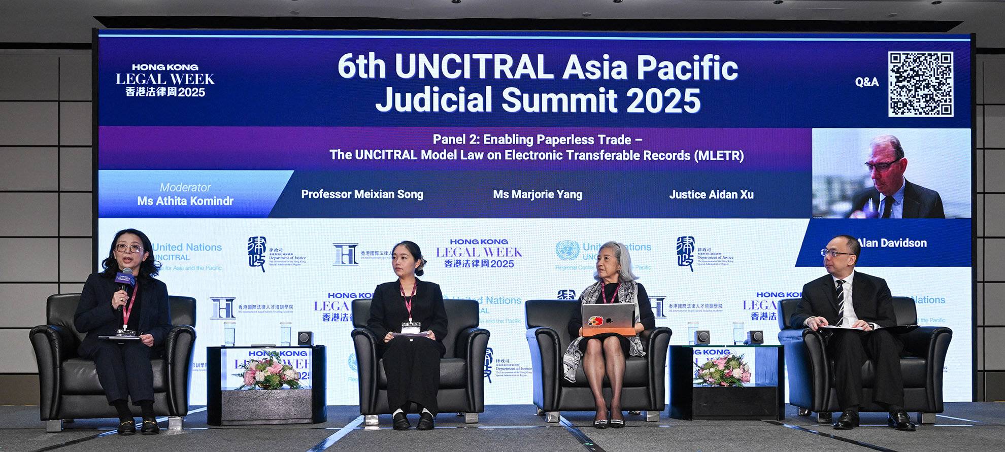 香港法律周2025今日(十二月一日)啓动,以「法汇香港 联通世界」为题,展开为期一连五日的活动。图示(左起)联合国国际贸易法委员会亚洲及太平洋区域中心主任Athita Komindr丶中国大连海事大学副教授宋美娴教授丶亚太区经济合作组织商贸资询理事会中国香港代表兼溢达集团董事长杨敏德丶新加坡最高法院法官Aidan Xu和联合国国际贸易法委员会第四工作组主席Alan Davidson博士出席第六届联合国国际贸易法委员会亚太司法高峰会2025——司法会议的专题研讨(二):实现无纸化贸易 -《联合国国际贸易法委员会电子可转让纪录示范法》。