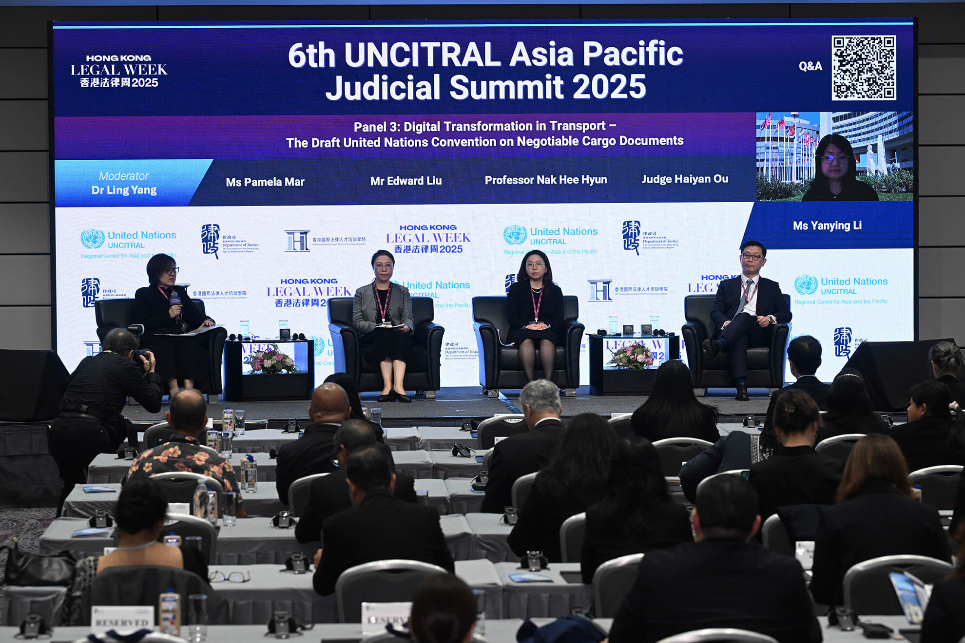 香港法律周2025今日(十二月一日)啓动,以「法汇香港 联通世界」为题,展开为期一连五日的活动。图示(左起)律政司香港国际法律人才培训办公室主任杨玲博士丶中华人民共和国最高人民法院民四庭法官欧海燕丶韩国成均馆大学法学院副教授兼韩国大法院前研究法官Nak Hee Hyun教授丶国际航运公会中国办事处兼上海代表处首席代表兼海问律师事务所有限法律责任合夥合夥人刘洋和联合国国际贸易法委员会法律干事李彦莹出席第六届联合国国际贸易法委员会亚太司法高峰会2025——司法会议的专题研讨(三):交通运输数字转型 - 联合国《可转让货物单证公约草案》。