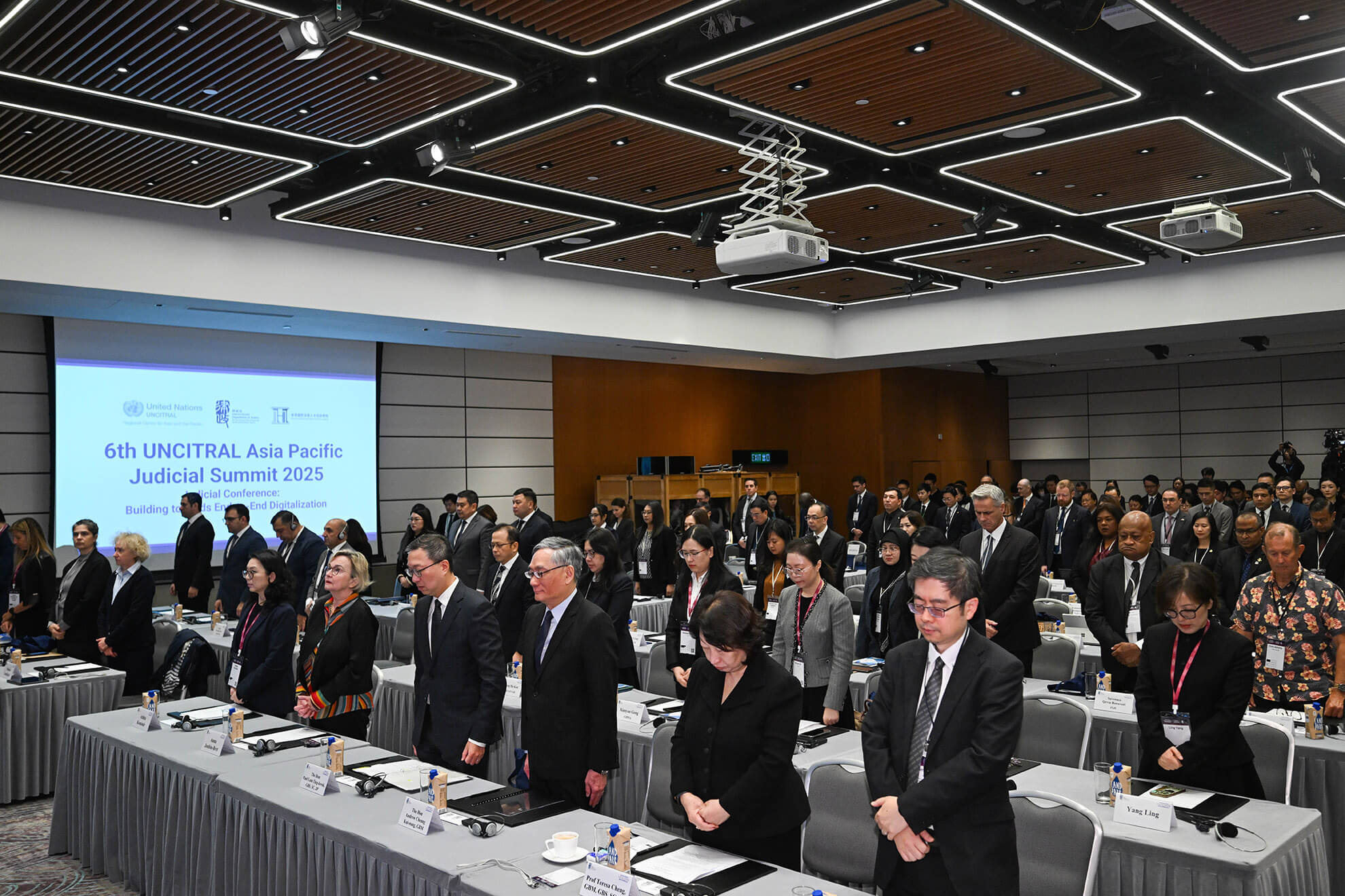 香港法律周2025今日(十二月一日)展开。图示全场人士在活动开始前站立默哀,以悼念大埔火灾罹难者。