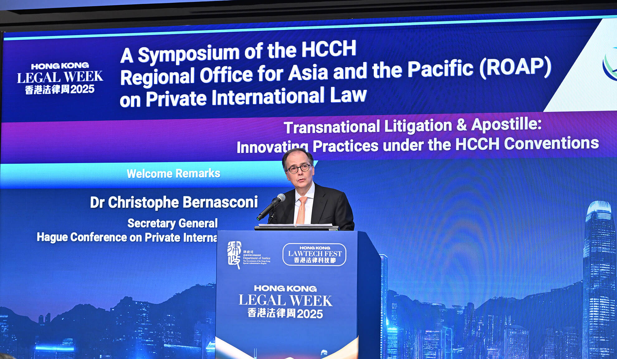 海牙国际私法会议秘书长Christophe Bernasconi博士今日(十二月三日)在香港法律周2025—海牙国际私法会议亚太区域办事处国际私法研讨会上致欢迎辞,并发表主题演讲。