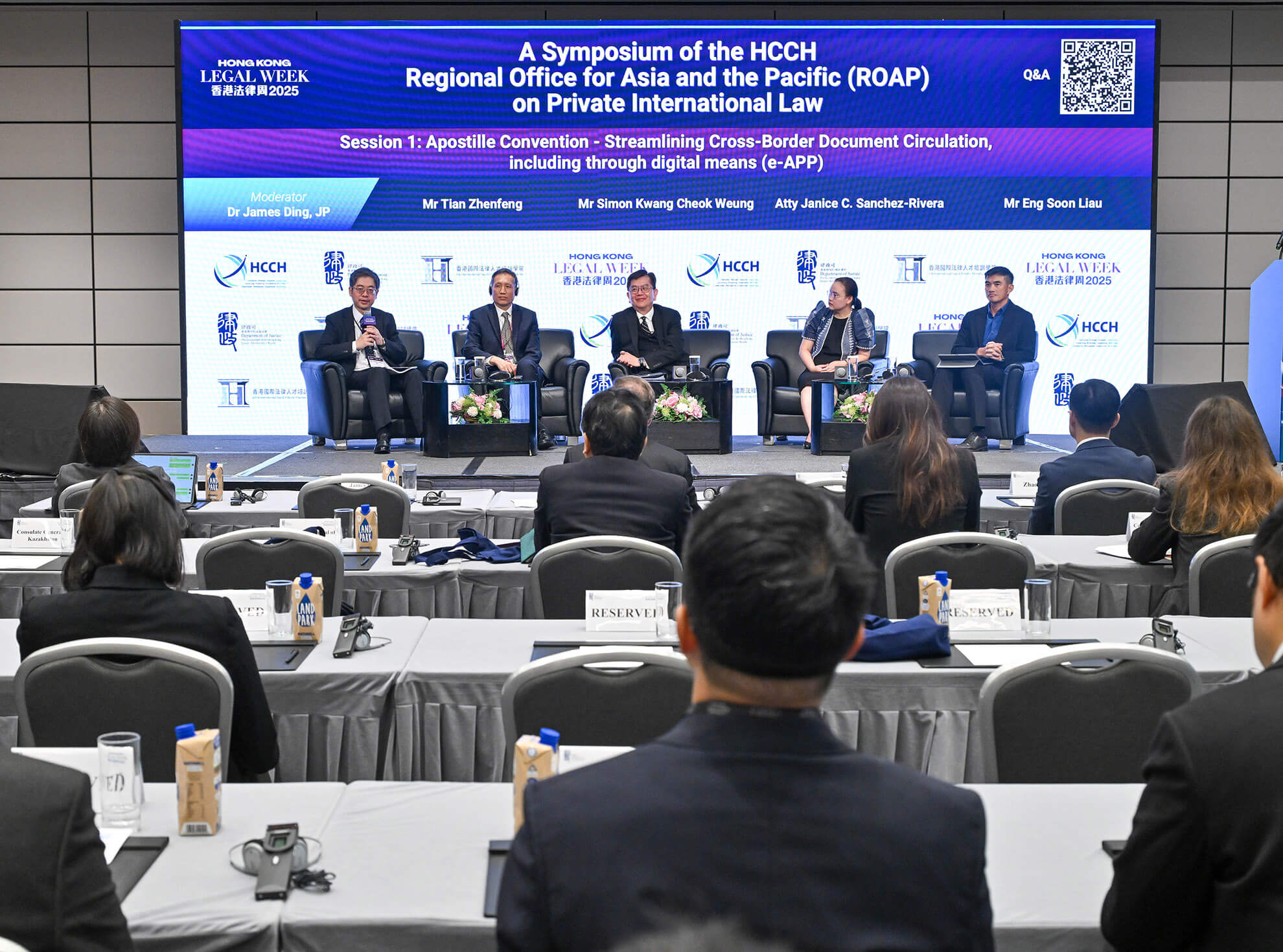 香港法律周2025—海牙国际私法会议亚太区域办事处国际私法研讨会今日(十二月三日)举行。图示(左起)律政司国际法律专员丁国荣博士丶中华人民共和国外交部驻香港特别行政区特派员公署领事部副主任田振峰丶高等法院司法常务官邝卓宏丶菲律宾外交部领事事务局认证处代理处长Janice C. Sanchez-Rivera和新加坡资讯通信媒体发展局企业转型创新集团数字公用事业集群总监廖荣顺出席研讨会的专题研讨(一):《海牙认证公约》— 简化跨境文件流通程序,包括透过数字化方式(电子认证)。