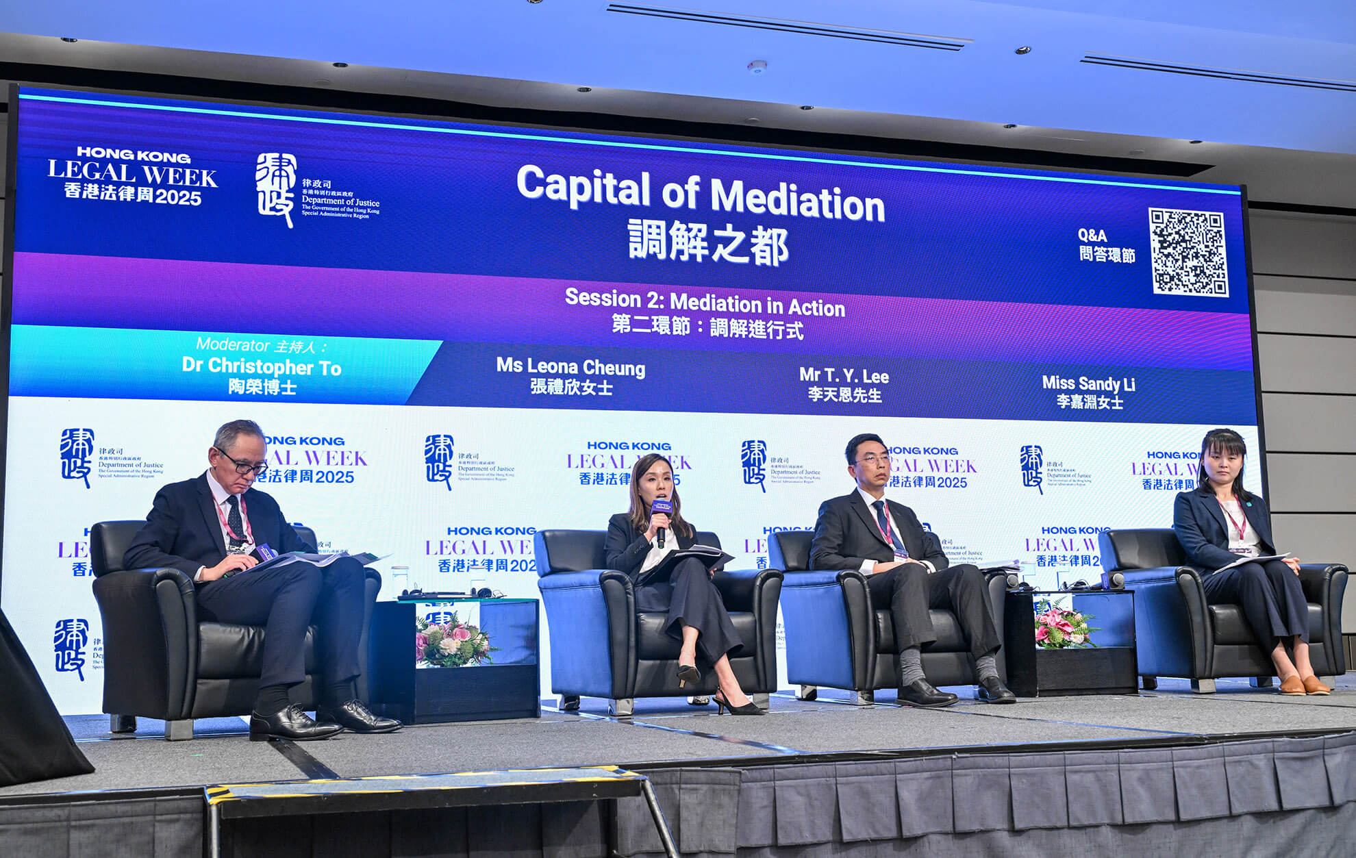 香港法律周2025—「调解之都」论坛今日(十二月三日)举行。图示(左起)香港调解会主席陶荣博士丶律政司法治建设办公室首席政府律师张礼欣丶金融纠纷调解中心署理行政总裁李天恩丶民政事务总署助理署长李嘉渊出席第二环节:调解进行式。