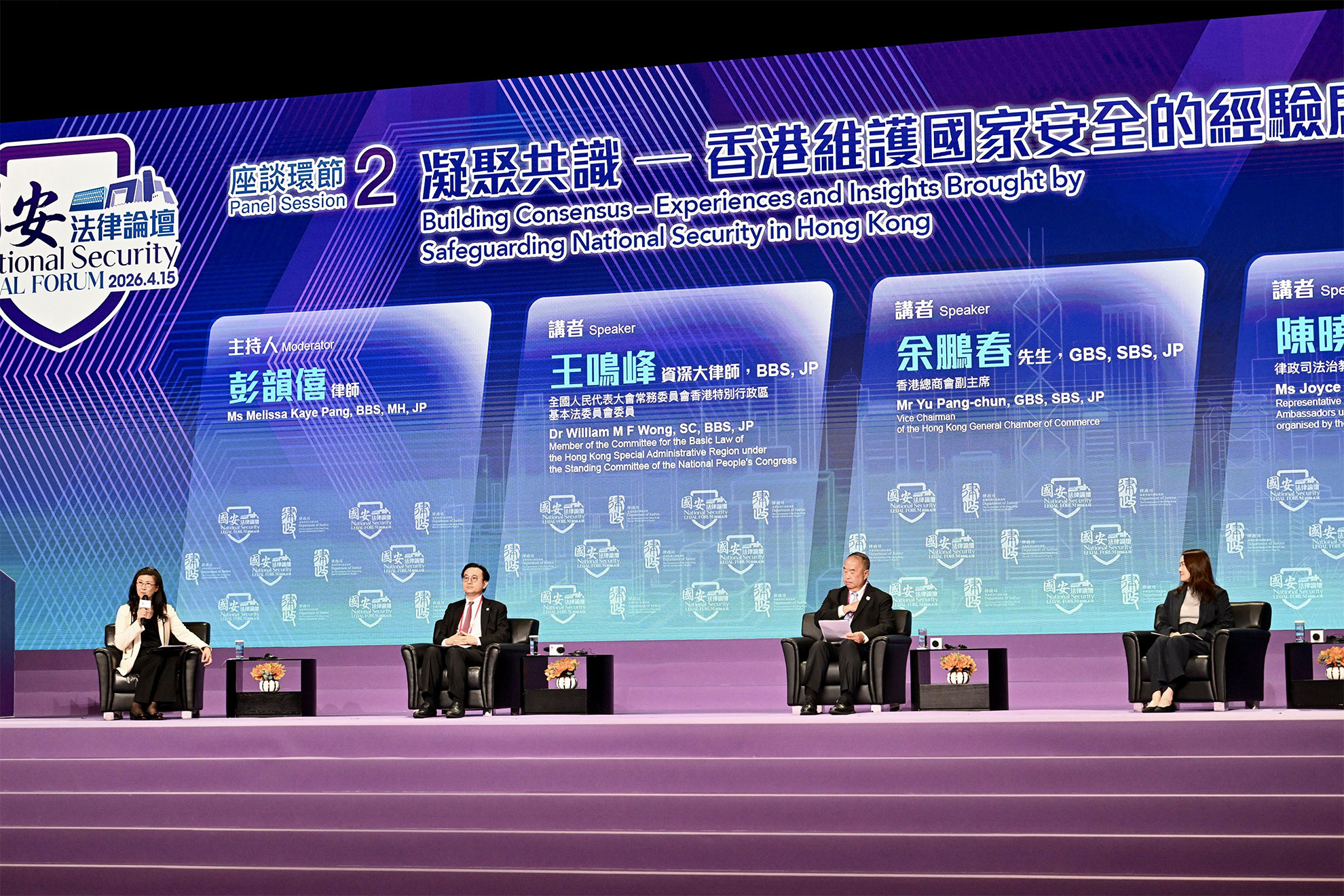 律政司今日(四月十五日)以《「一国两制」下香港维护国家安全的实践》白皮书为题举办国安法律论坛。图示(左起)律师彭韵僖、全国人大常委会香港特区基本法委员会委员王鸣峰资深大律师、香港总商会副主席余鹏春,以及律政司法治教育领袖培训计划法治教育大使陈晓宜出席论坛的座谈环节2:凝聚共识——香港维护国家安全的经验启示。