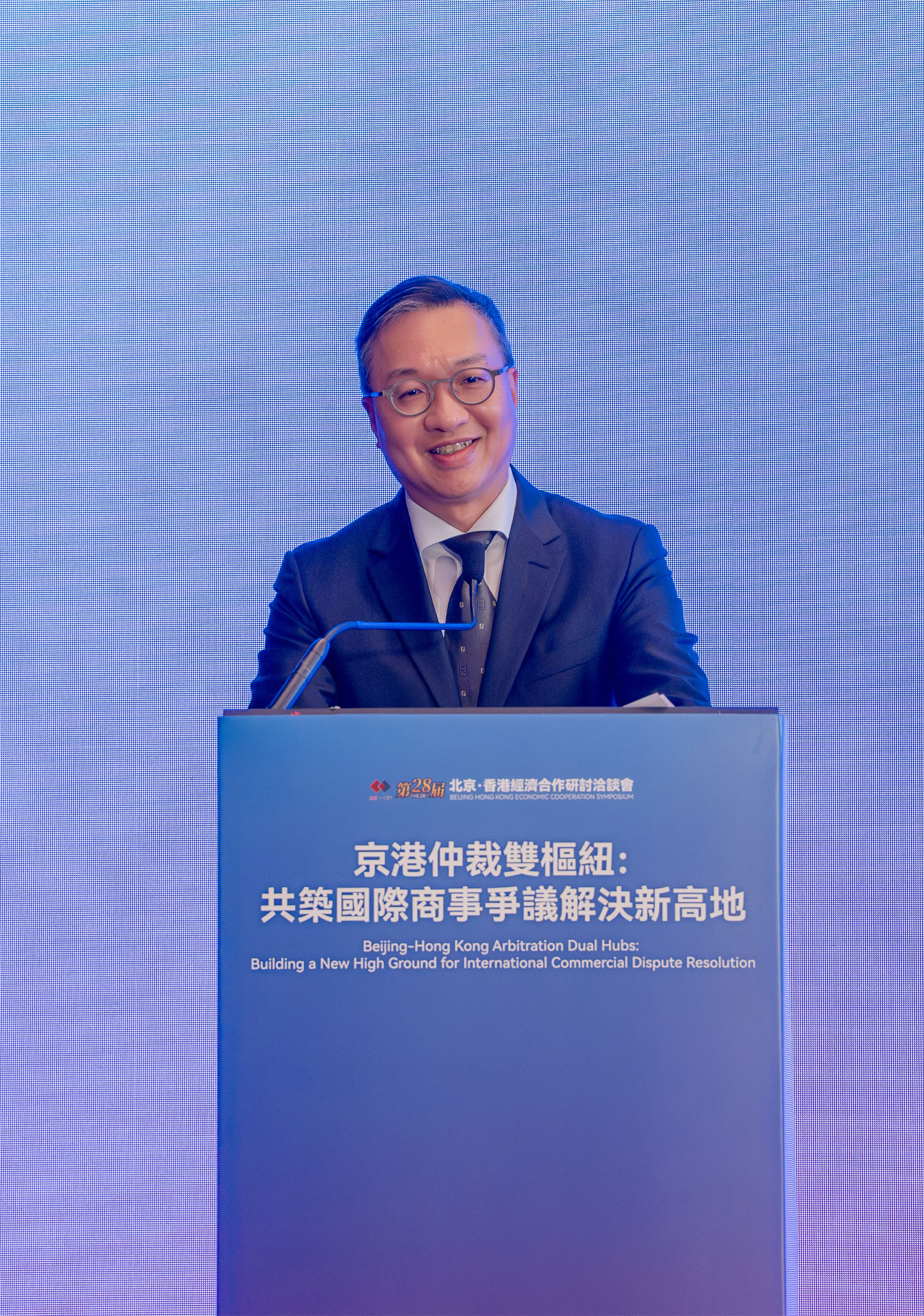以下是律政司司长林定国资深大律师今日(十一月十三日)出席第28届北京.香港经济合作研讨洽谈会京港仲裁法律服务专题推介活动就「京港仲裁双枢纽:共筑国际商事争议解决新高地」主题的致辞: