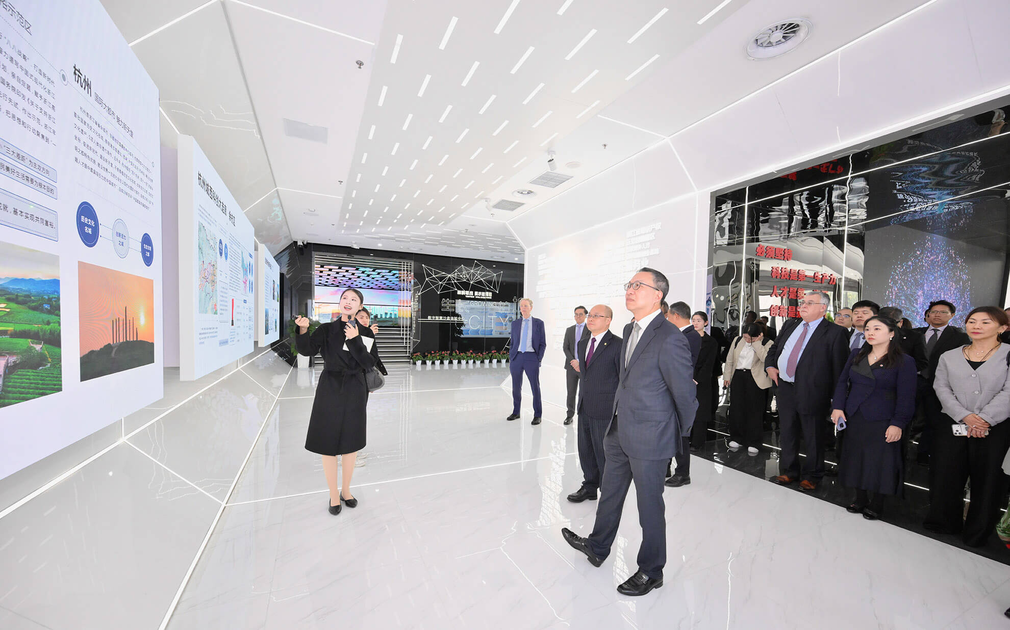 律政司司長林定國資深大律師(前右)與代表團今日(三月二十五日)參觀杭州未來科技城城市展館,了解杭州在人工智能和智慧城市等領域的發展。