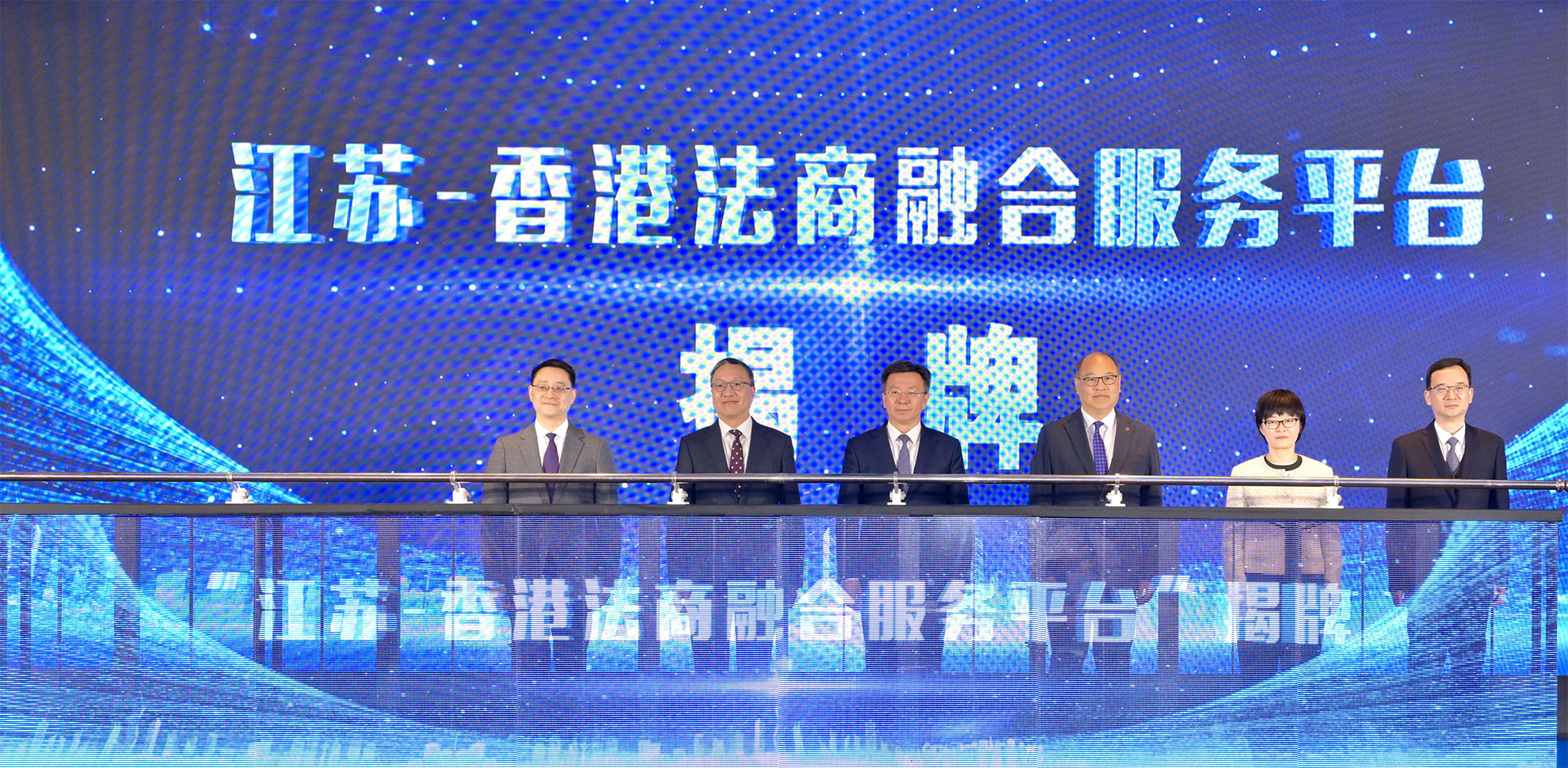 律政司司長林定國資深大律師今日(三月二十六日)出席江蘇──香港法商融合服務平台揭牌儀式。 圖示林定國(左二)與南京巿巿長李忠軍(左三 )及其他嘉賓在儀式上合照。