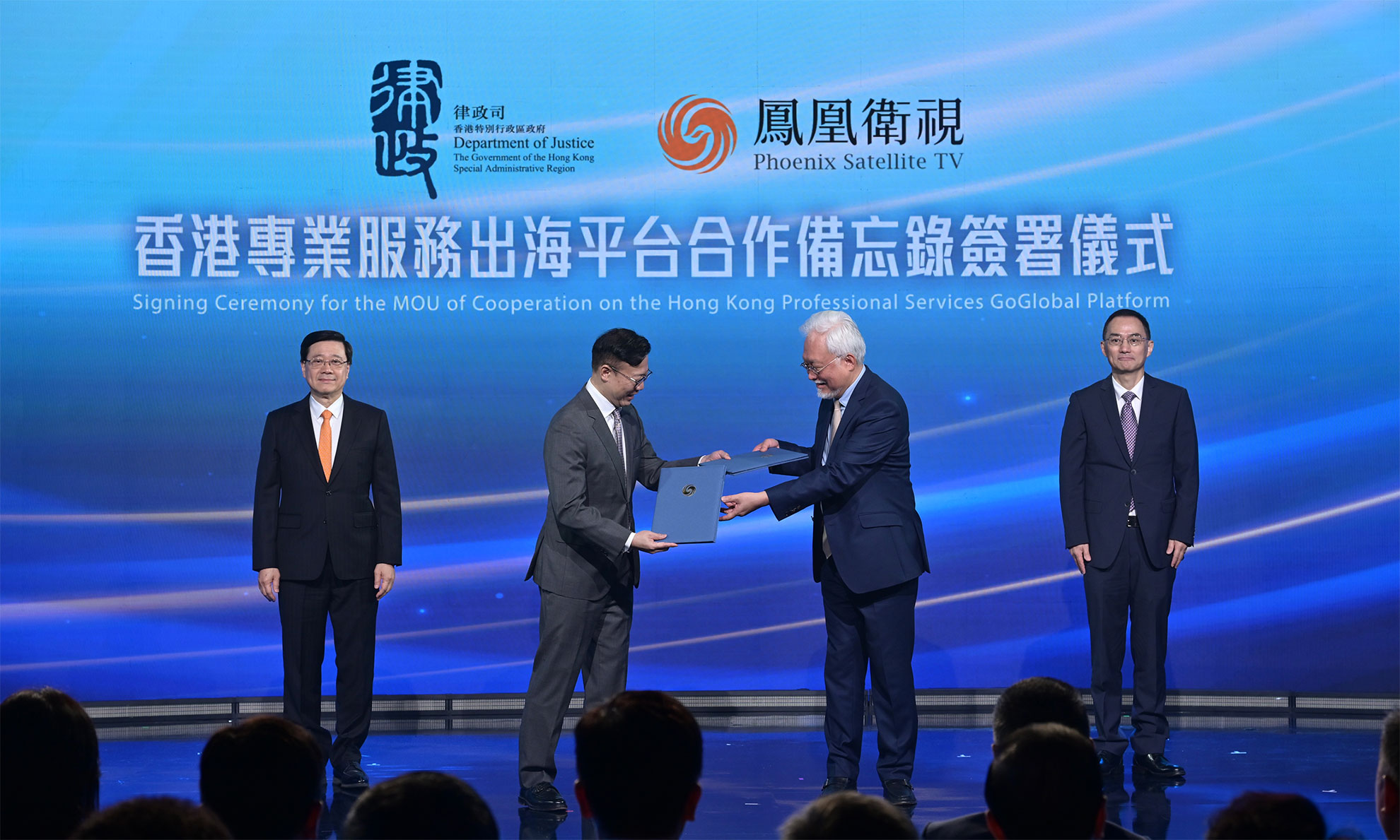 行政長官李家超今日(三月三十一日)出席鳳凰衛視30周年台慶盛典。圖示李家超(左一)和鳳凰衛視董事局主席兼行政總裁徐威(右一)見證律政司副司長張國鈞博士(左二)和鳳凰衛視執行副總裁兼集團財務總監楊家強(右二)交換香港專業服務出海平台合作備忘錄簽約文本。