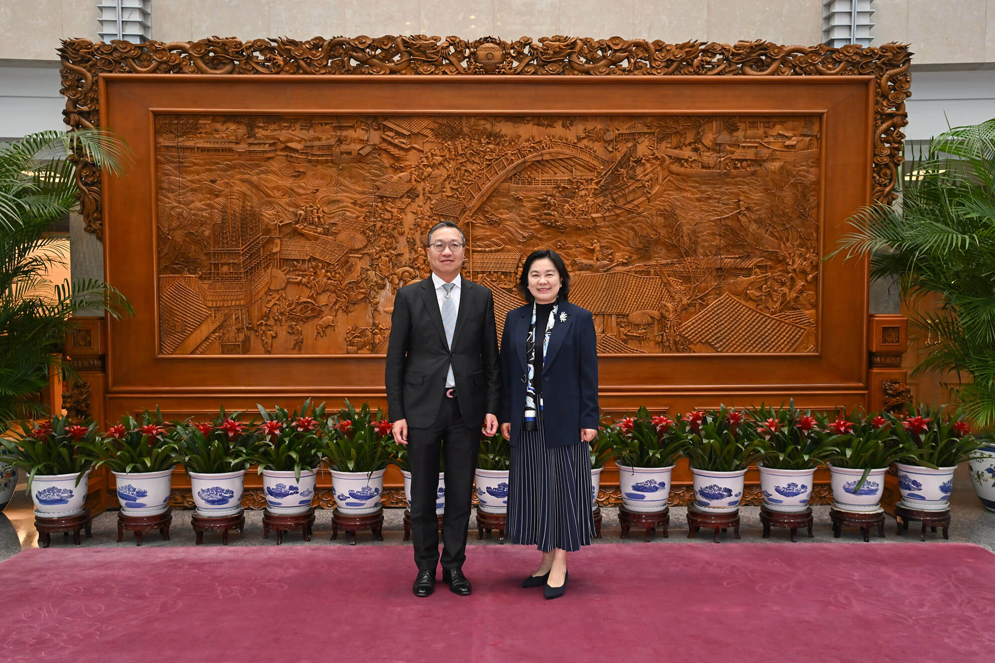 律政司司長林定國資深大律師(左)四月二十日與外交部副部長華春瑩(右)會面。