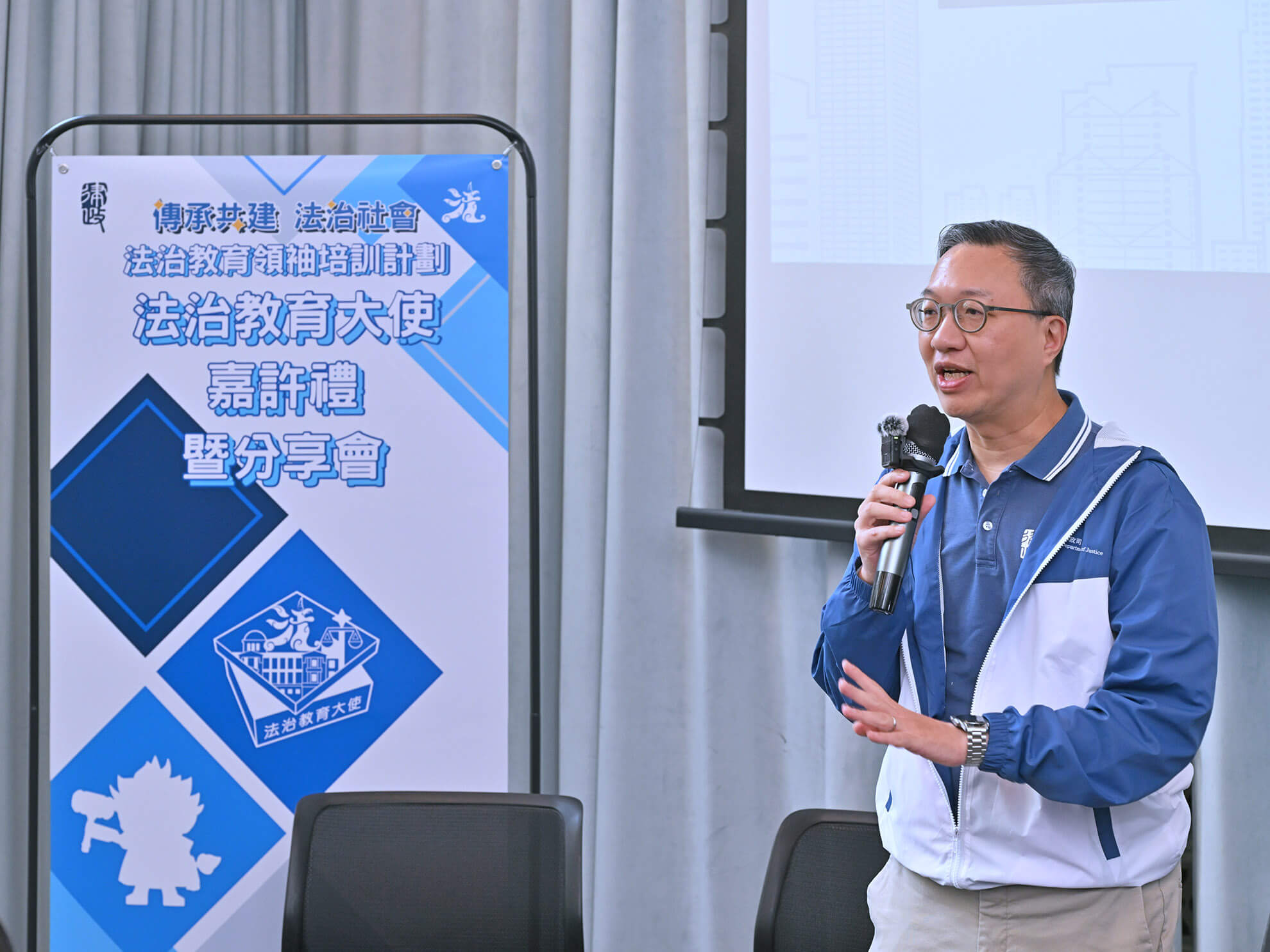 林定國、律政司副司長張國鈞博士、保安局局長鄧炳強、善導會執行委員會主席潘兆童法官和民政及青年事務局副局長梁宏正其後向學員頒發證書及法治教育大使襟章,以表揚有關學員持續參與和完成培訓計劃的所有課程,並積極在社區不同崗位上推廣法治。