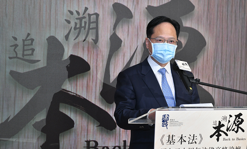 我們談到「追本溯源」,當然要提到今天早上張主任(全國人大常委會香港特別行政區基本法委員會副主任張勇)提到的「溫故知新」,行政長官亦提到「毋忘初心」,我覺得這三句話完全是一致的。如果我們要「追本溯源」的話,就像薛大法官(國際法院副院長薛捍勤法官)提到,張主任亦提到,要從簽訂不平等條約的歷史背景下開始。